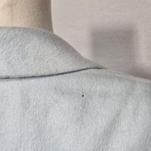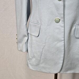 Vintage womens tailored blazer jacket in a soft light blue angora and wool fabric with a smooth matching logo jacquard lining.