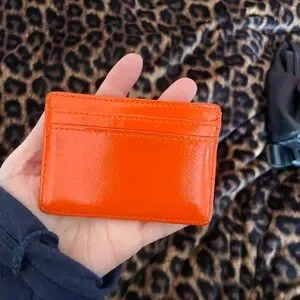 Bright orange card holder with gold logo. Compact and chic design.