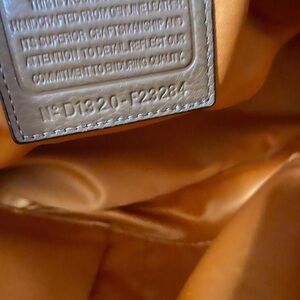 Elegant Coach shoulder bag in rich brown leather. Features dual handles and a red tag accent. Ideal for daily wear. measurements are width is 17 1/2 length is 9 1/2.