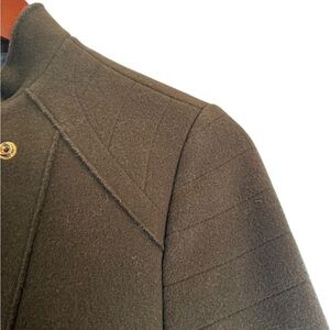 Stylish olive jacket with asymmetrical zipper. High collar design. Perfect for layering.