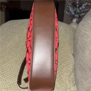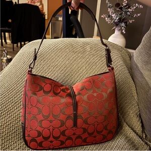 Vintage Coach Hamptons Hobo Clip Shoulder Bag in red signature jacquard canvas and brown leather - minor spots on interior and side of bag shown in photos but otherwise in pristine condition!
