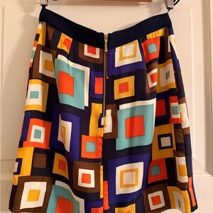 A-line skirt with bold geometric squares. Features vibrant colors for a striking look. Size 4. 100% silk. In great condition. Does have a slight hanger mark on the band (see photo). Please let me know if you have any questions or need measurements.