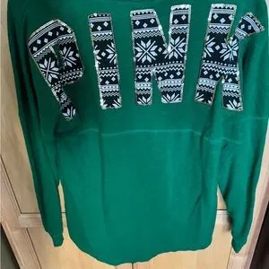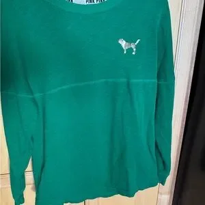 Vibrant green top with bold PINK branding outlined in sequins featuring a sequin dog on the front left! Comfortable and stylish. Oversized XS fits like a small/medium