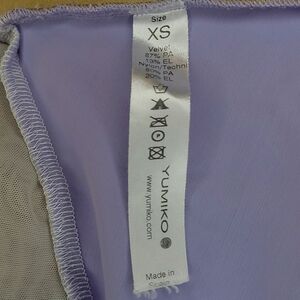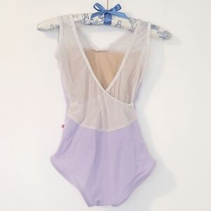 Lilac with white velvet trim and mesh crisscross back v-neck ballet leotard by Yumiko in the Masha Mesh style. Size adult extra small. In excellent used condition. Full front double lining. Retails for $101. Comes from a smoke free pet friendly home. All sales help me pay my rent.