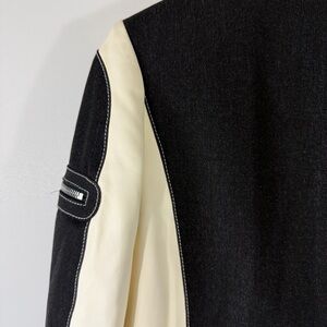 This St. John Sport jacket is amazing. Buttery soft cream leather with black super soft denim looking fabric. Lots of zippers for an edgier moto style look. Great used condition.