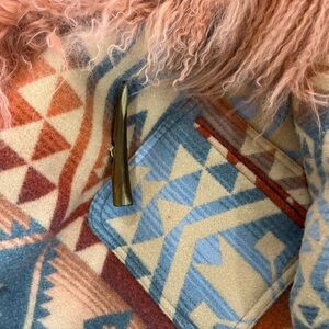 Napped Pendleton blankets: 82% Wool, 18% Cotton. Wool Cashmere facings and Silk Rayon peach skin lining.Our Mongolian Fur is a shaggy long hair Mongolian sheep shearling.