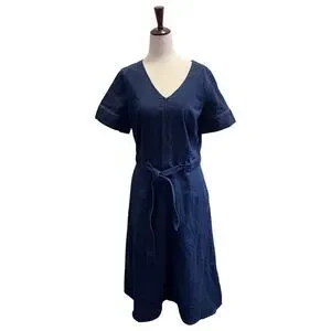 This Liz Claiborne dress features a flattering V-neckline and a zip closure for easy wear. Perfect for a variety of occasions such as Holy Communion, parties, workwear or casual outings, this fit & flare dress in size 4 is made of denim fabric with no stretch. The dress comes with a tie belt to accentuate your curves and has faux breast pockets and regular pockets. The short flared sleeves add character to the dress while the solid blue color makes it versatile for any season.