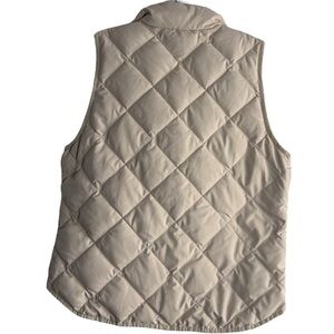This J. Crew quilted puffer vest has a 100% polyester shell, and is insulated with 60% down, and 40% feathers. Gold zipper, standup collar, flat pockets, curved hem in back. Cream color. Style is “Excursion”, 92465. Preppy, winter, fall, minimalist.