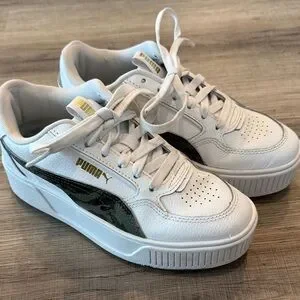 Stylish Puma sneakers with a white base. Camo detailing and gold accents. Perfect for everyday wear.
