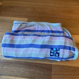 Soft and cozy Kickee Pants swaddle blanket featuring pastel green and purple stripe design. Made from a stretchy, breathable bamboo blend for gentle comfort on baby’s skin. Lightweight yet warm—perfect for swaddling, cuddling, or on-the-go use. Excellent pre-loved condition.