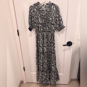 Chic maxi dress with a floral design. Features a flattering fit and elegant style. Super cute and easy to dress up or down.
