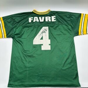 Green jersey with yellow and white accents. Features number 4 on front. Comfortable and stylish design. This is a used item with multiple stains in the front of small spots. See pics for full condition. Vintage Logo Athletic Brett Favre Green Bay Packers NFL Football Jersey Mens XL