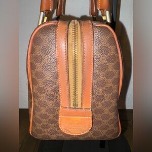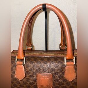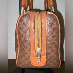 vintage Celine Macadam Boston bag, known for its distinctive all-over monogram pattern. This style is part of Celine's historical 'Triomphe' canvas line, featuring leather trim and gold-tone hardware.