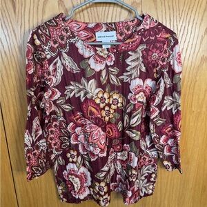 Chic floral blouse with burgundy and cream tones. Features 3/4 sleeves. Ideal for casual outings.