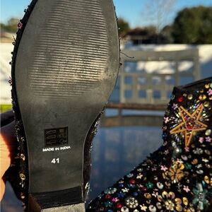 These Free People booties are seriously special and always get compliments when I wear them. The black suede is fully covered in colorful beading, sequins, and embroidered details that give them a fun, boho feel without being costume-y. I love the stacked block heel because it’s extremely comfortable and easy to walk in, and the ankle height works with everything from jeans to dresses. I’ve only worn these twice and they received so many compliments both times. I’m only selling because I’m trying to downsize and get rid of most of my shoes, not because there’s anything wrong with them. They’re in great condition and perfect if you want a statement shoe that still feels like you. Please note that some sequins are missing but very few….