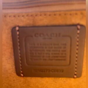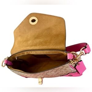 Chic Stylish Coach shoulder crossbody bag in bright pink and tan. Features a sleek design with luxury brown suede interior and gold colored hardware accents. New with Tags. Same day shipping M-F. Smoke free home. 1/6