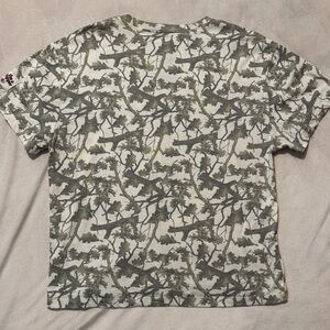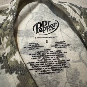 Stylish Dr Pepper t-shirt with a unique camouflage pattern. Features bold red logo on the front and a small saying at the top. Is NWOT size small but could definitely fit bigger