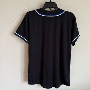 Stylish and rare black jersey with blue Dodgers logo. Features button-up design and white trim. Youth xl is the perfect oversized alternative to a women’s M jersey with slightly longer sleeves and length