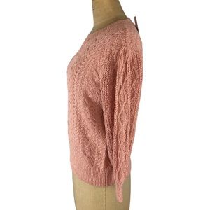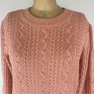Size large, one of the few Free People pieces that fits a bit on the smaller side/true to size. Beautiful peachy light pink, colourway is called Bubble Bath. Rounded neck. Puffed sleeve, 3/4 length. Fitted in the body. Hits at about the hips pending torso length. Cableknit. Soft and very comfy! Medium weight sweater.