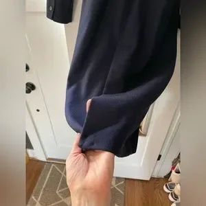 Elegant navy blue coat. Features a belted waist. Perfect for a sophisticated look.