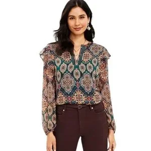 EUC: {LOFT} Womens Tapestry Ruffle Split Neck Blouse - Size XL