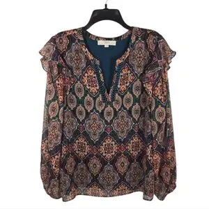 {LOFT} Womens Tapestry Ruffle Split Neck Blouse - Size XL