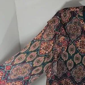 Stylish blouse with intricate patterns. Features a mix of vibrant colors. Perfect for adding flair to your outfit.