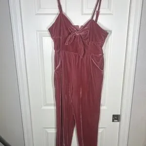 Unique Vintage pink velvet jumpsuit in a rich color. Features a charming bow detail on the front and adjustable straps.