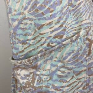 Features: Racerback silhouette, oversized patch pockets, dropped armholes, printed pattern