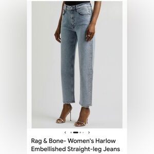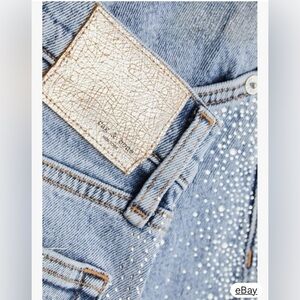 Light blue denim with subtle silver crystal accents. Classic button closure. Front pockets included. These jeans are show-stoppers. Beautiful embellishment, great color and barely worn. You will love these! Rag and Bone does a great job with crystal accents. All stones intact.