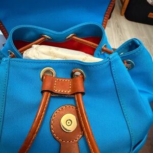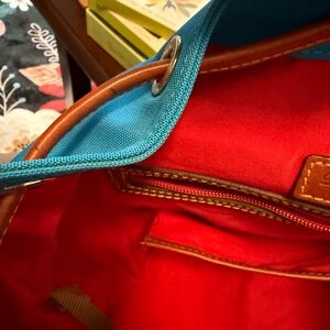 Dooney and Bourke nylon backpack with leather accents. Color is closer to a teal blue and then an ocean blue that is reflected in the photos. Features two outside pockets and one front zipper pocket. Drawstring and snap closure. Three inside pockets plus one zipper pocket and key security lanyard. Shoulder straps are tan nylon. Please note discoloration along seams, white mark on bottom of bag and somewhere near the snap closure, inside pocket stitching has started to come undone. Likely can be fixed. (photos of all marks included). Base 11”x7.5”. 13” high. Opening expands to 13”x14”.