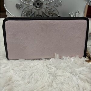 Elegant Juicy Couture wallet in blush. Features a gold chain for easy carrying. Stylish crest design on front.