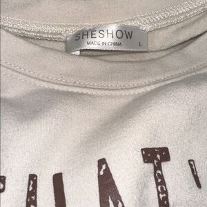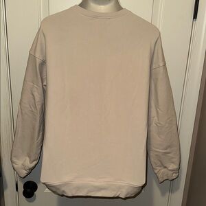 Casual beige sweatshirt with bold graphic text.