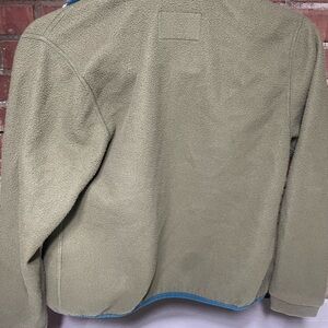 Kids REI Co-op fleece jacket in a versatile olive green color with blue trim accents. Made from soft, warm fleece that’s lightweight yet cozy—perfect for layering or wearing on its own. Features a full-zip front, zippered hand pockets, and a comfortable stand collar for added warmth. Durable and designed for outdoor adventures, school, or everyday wear. Size Kids Medium (10–12). In good pre-owned condition with normal wear, no major flaws noted. Great quality jacket from a trusted outdoor brand.
