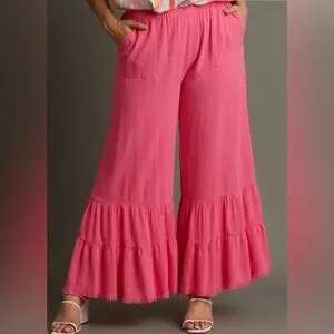 Umgee NWT Pink Wide Leg Ruffled Pants Raw Hem Linen Blend Sz S
