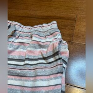 Soft pajama pants with gray and pink stripes. Perfect for relaxing at home.