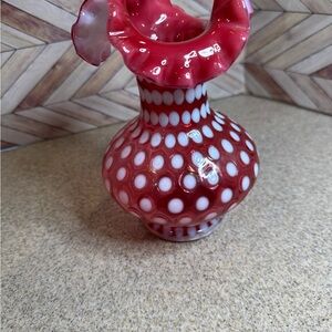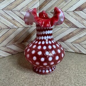 Fenton cranberry adolescent polkadot or coin dot ruffled vase from the 1950s. Patterned 2257 – CR highly collectible.