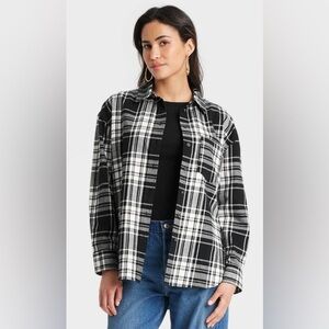 Women's Oversized Flannel Long Sleeve Collared Button-Down Shirt - Universal Thread™ Black Plaid XS: Front Pocket