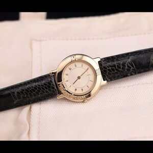 Elegant Yves Saint Laurent watch with a gold case and black leather strap. Perfect for any occasion.