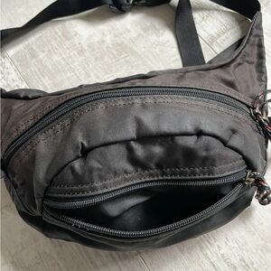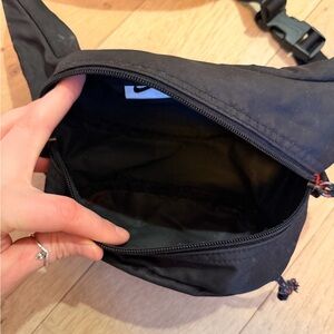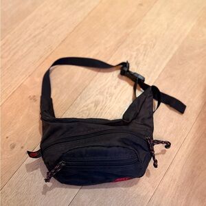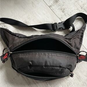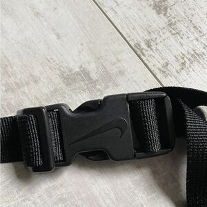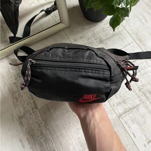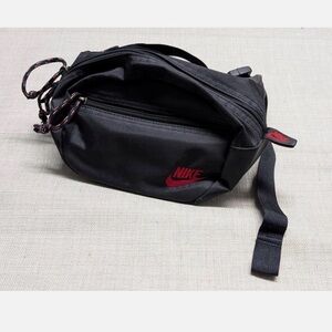 Sleek black Nike belt bag. Features bold red logo. Ideal for hands-free convenience.