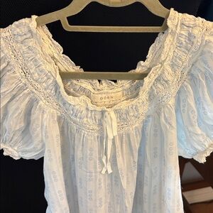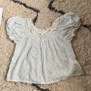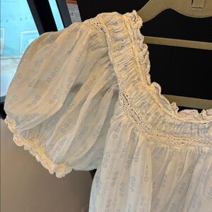 Charming sheer blouse with puff sleeves. Features delicate lace details.
