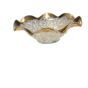 Beautiful glass bowl with intricate clear patterns and a gold rim. Perfect for decor or serving. Often used as a candy dis, condiment dish, or nut dish.