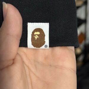 Bold Bape design on a black crewneck. Features iconic space head graphic in gray. Ideal for streetwear enthusiasts.