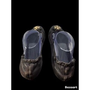 The product is a pair of Tory Burch Mini Packable Tortoise Travel Logo Flats in size 8.5. These gold ballet flats feature a round toe, slip-on closure, and are made of leather with a rubber outsole. They are lightweight and stretchy, making them suitable for various occasions such as parties, casual outings, and business meetings. The flats have Tory Burch's signature medallion and logo accents, and are designed in a classic ballet style. Perfect for year-round wear, these versatile flats are a stylish and practical addition to any woman's wardrobe.