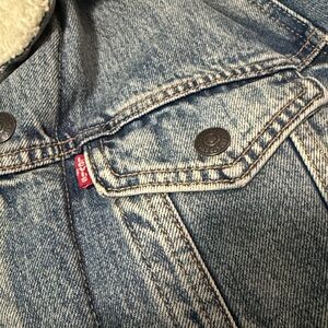 Levi's jacket with soft sherpa lining. Light blue denim. Classic style. Listed size S, fits like a women’s size S/M. Feel free to message me with any questions about measurements!
