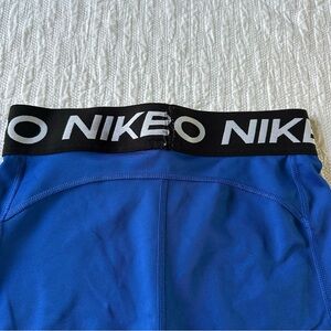 Blue Nike Pro shorts. Black waistband with logo detail.