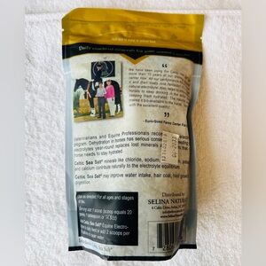 Celtic Sea Salt Selina Natural Horse Electrolytes provide a simple, natural way to support hydration and mineral balance in horses. Veterinarians and equine professionals recommend electrolyte supplementation to help prevent dehydration, which can lead to serious health issues. This product contains only unrefined, hand-harvested Celtic sea salt, no sugars, additives, or fillers, delivering essential trace minerals in their natural form. Sustainably harvested and sun-dried, it comes in a 1-lb container. Not for human consumption.