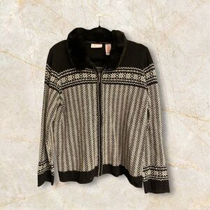 Elegant black and ivory sweater jacket with a luxurious fur collar. Ideal for a sophisticated look.