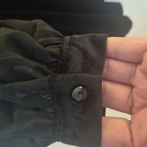 Fabric: Luxurious black velvet bodice and cuffs (95% Polyester 5% Elastane) with sheer, flowy chiffon sleeves.