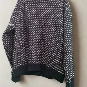 Vintage Birdseye knit fisherman sweater features a navy and cream pattern, ribbed cuffs and hem, and a sturdy crew neckline. A true cold-weather classic from L.L. Bean, made in Norway with 80% wool. While labeled mens, this is a unisex sweater depending on how you like your fit.